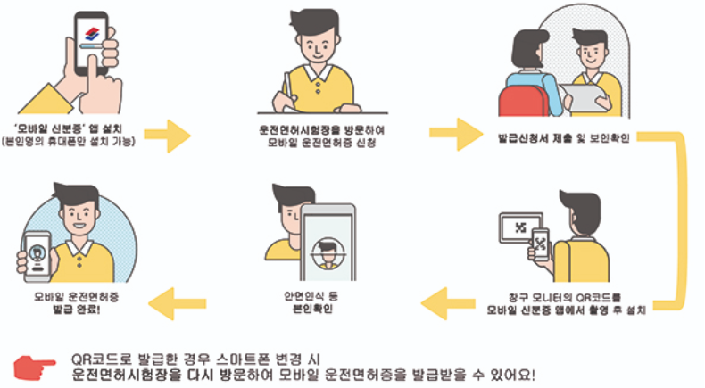 모바일신분증 앱을 다운로드하여서 운전면허시험장에 설치된 QR코드를 앱으로 촬영하면 됩니다. 이 방법은 즉시 발급이 가능 하지만 스마트폰 분실 시나 교체 시에 재만문해야 하는 단점이 있습니다.