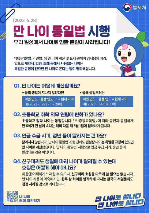 이번에 오는 23년 6월 28일부터 만 나이 계산으로 통일법이 개정되게 됩니다. 우리는 아직 변경된 통일법에 있어서 적응이 안 되고 있는 것은 사실입니다. 그래서 대중들에게 혼란과 적응을 돕기 위해서 좋은 정보를 알려 드리려고 합니다.
