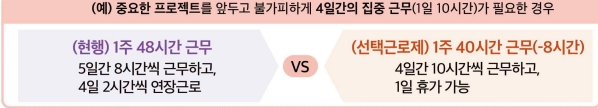 주 4,5일제 확대 등 근로자 시간주권 강화를 위해 선택근로제를 전 업종 3개월 연구개발 업무 6개월도 확대합니다. 현재 선택적 근로제를 활용하면 근로자가 근로일과 출퇴근 시간 등을 자유롭게 선택할 수 있으나 법상 허용하는 최대 활용 기간이 협소하기 때문에 활용도가 떨어지게 됩니다. 또한 근로자가 사용자에게 근로제 적용을 요청할 수 있는 절차도 도입됩니다.