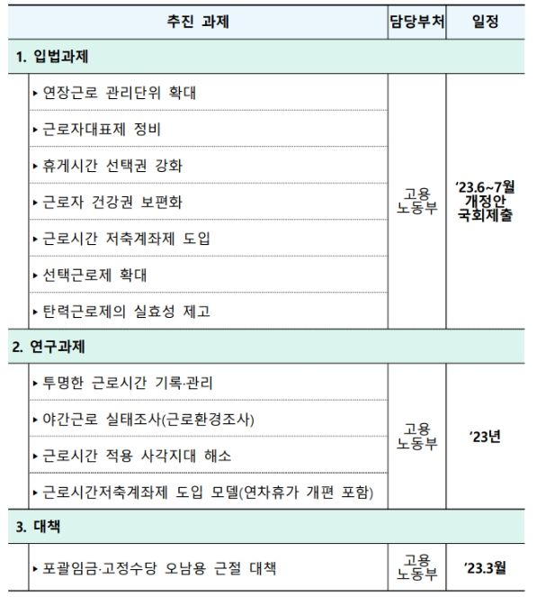포괄임금을 이유로 무한정 공짜야근이 이뤄지는 현실에서 근로시간 제도개편 추진 시 장시간 근로가 심화될 수 있다는 우려도 있습니다. 이에 따라 우리는 최초 기획감독 실시 등 강령한 조치로 포괄임금 오남용 근절을 추친하였고 포괄임금과 고정수당 오남용 근절대책을 이달 중 발표할 예정입니다.