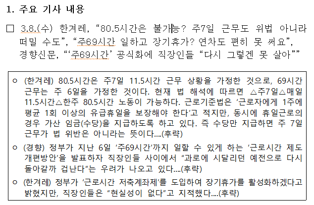 고용 노농부에서는 지난 6일에 실근로시간 단축 개편 방안에 대해 거론을 하였다. 1주 단위의 연장근로 칸막이를 제거하는 것이지 근로시간 총량이 늘어나는 것이 아니다고 해명을 하였습니다. 주당 최대 69시간 근로 허용 및 주 4일 근무가 가능한 선택근로제 확대 등을 담은 근로기준법 개정안에 대해서 MZ세대에 주목받고 있는 반대표명 하는 사람들의 반발이 커지는 추세입니다. 특히 현행 보상휴가제를 근로시간 저축계좌로 확대하고 개편하면 저축한 연장근로를 임금 또는 휴가로 선택할 수 있는 제도적 기반을 마련함에 따라 기존의 연차휴가와 결합하면 안식월, 한 달 살기 등 장기휴가도 실현 가능 할 전망입니다.