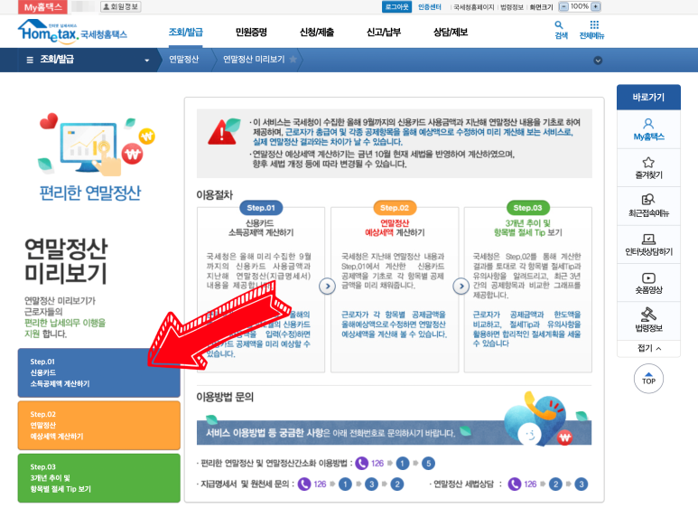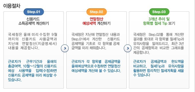 먼저 이용절차에 대해서 한 번씩 일어 보시면 이해하기 쉬울 겁니다. 신용카드 소득공제액 계산과 연말정산 예상세액 계산하기 그리고 3개년 추이 및 항목별 젤세 팁까지 있습니다. 글을 잘 읽어 보시고 몰랐던 부분들을 알게 해 주고 도움이 많이 되실 겁니다.