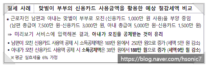 맞벌이 부부의 신용카드 사용금액을 활용한 예상 절감 세액 비교한 글입니다. 누구나 해당되는 사항은 아니므로 해당되시는 분들에게는 좋은 정보가 되실 거라 믿고 잘 참고 하셔서 도움이 되었으면 합니다. 예산 세액과 정산 간소화자료를 통하여 조금 더 좋은 정보를 드릴 수 있도록 항상 노력하겠습니다.