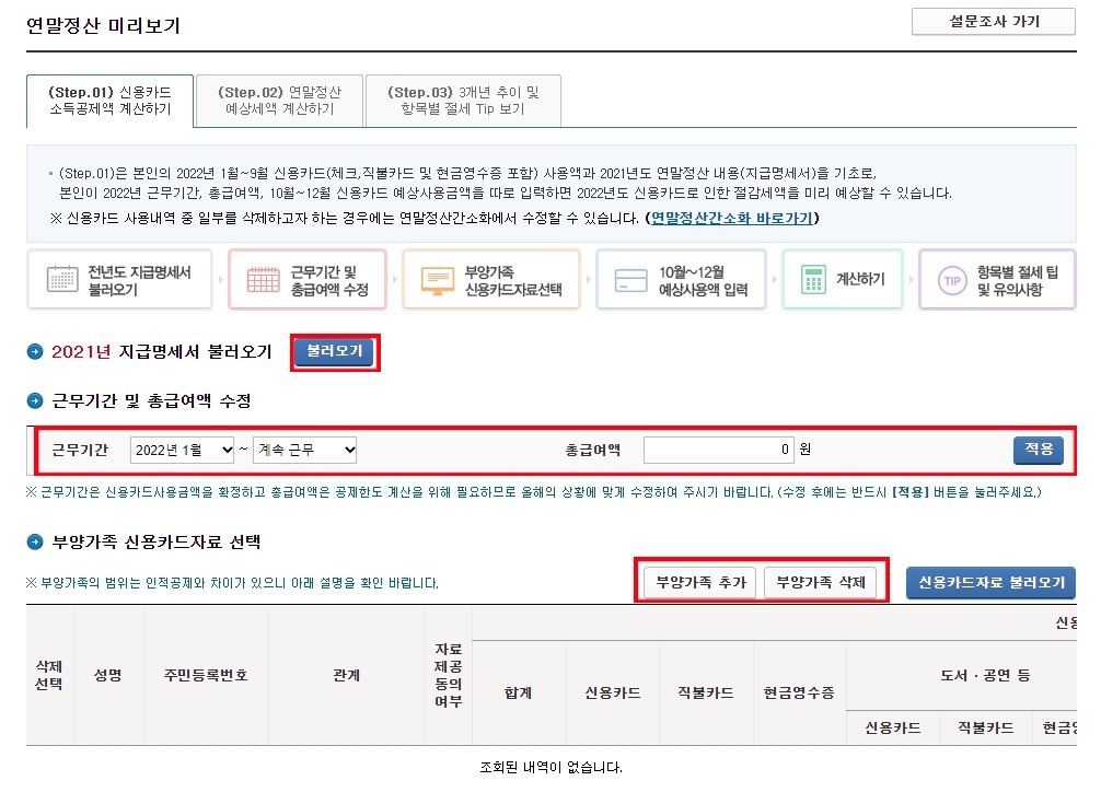 아래 그림과 같이 연말정산 미리 보기라는 창이 뜨게 됩니다. 여기서 2021년 지급 명세서 불러오기 옆에 불러오기라고 클릭하는 부분이 빨간색으로 네모 박스 모양이 보입니다. 불러오기를 클릭하시면 아래 근무기간 및 총급여액 수정이라는 제목 하단에 나의 정보가 뜨게 됩니다. 이후 부양가족이 있으시면 부양가족을 추가해서 내용에 있는 칸을 다 채워주시고 만약 없거나 취소를 해야 되는 상황이라면 부양가족 삭제라는 버튼을 클릭하여 삭제해 주시면 되겠습니다.