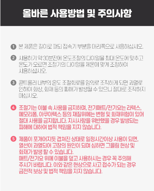 위와 같이 제품은 구겨지지 않도록 주의해 주고 쫙 펴져 잇는 상태로 관리 및 사용을 해야 하겠습니다. 가장 주의해야 할 점은 조절기는 이불속에 넣어서 사용하는 것을 금지하겠습니다. 전기매트나 전기요는 라텍스 재질이라서 화재의 위험이 있을 수 있습니다. 또 한, 제품이 겹쳐진 상태로 일정시 간 이상 사용하게 되면 열선이 과열되어 고장의 원인이 되기도 합니다. 이점 꼭 숙지해 주시고 이와 같은 현상으로 고장이 나거나 화재가 일어나거나 하지 않도록 각별히 주의가 필요하겠습니다. 이러한 상황이 있을 때는 제품상 문제가 아니므로 법적 책임을 지지 않는다고 합니다.