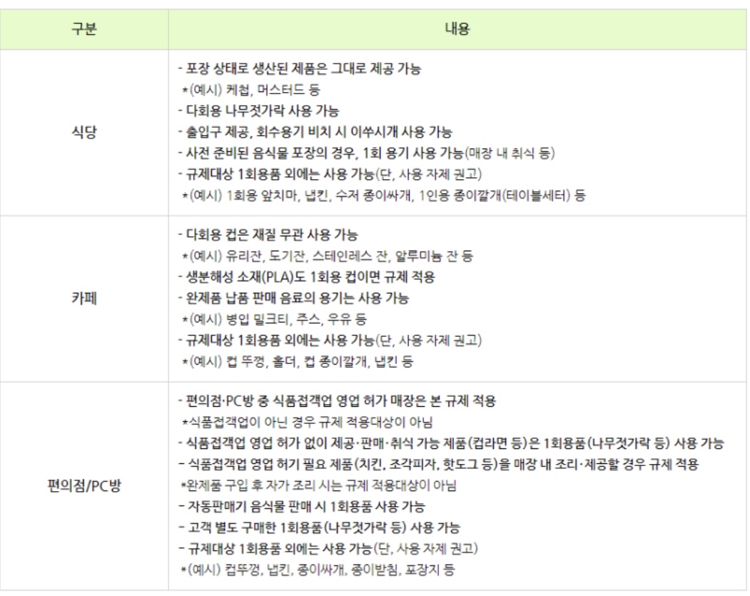 식당에서는 포장 상태로 생산된 제품은 그대로 제공이 가능합니다. 예를 들면 케첩, 머스터드 등 있습니다. 다회용 나무젓가락, 출입구 우산 비닐 대신 회수용기 비치 시 이쑤시개 사용 가능합니다. 사전 준비된 음식물 포장의 경우, 1회 용기 사용 가능합니다. 규제 대상 1회 용품 외에는 사용 가능합니다. 단 1회용 앞치마, 냅킨은 수저, 종이 싸개 등등 금지가 되겠습니다.