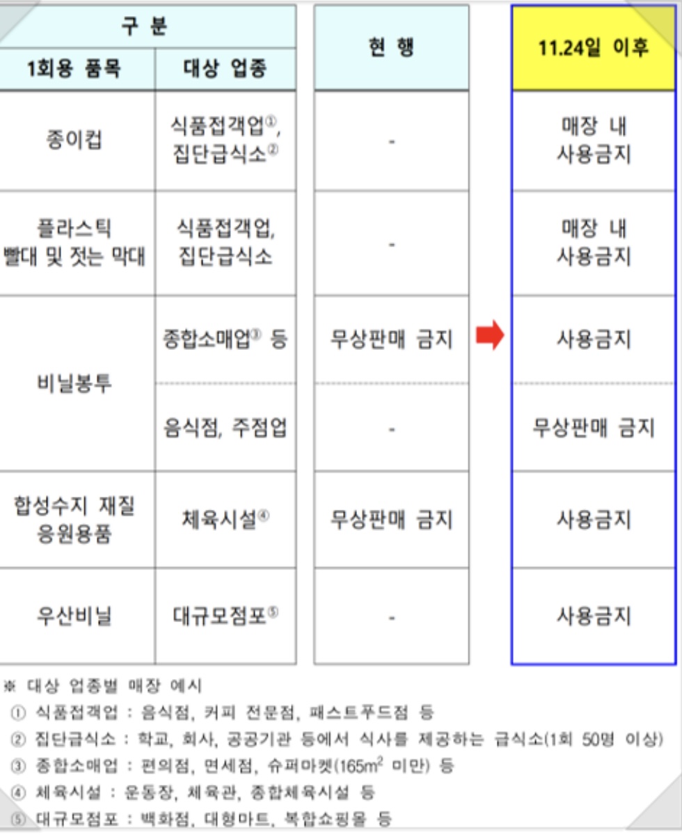 1회용 품목으로는 종이컵, 플라스틱, 빨대, 비닐봉투, 수저, 우산 비닐 등이 있습니다. 앞으로는 백화점이나 각종 식당 등등 우산을 들고 우리에게 편리한 일상을 주었던 것들이 없어지게 됩니다. 대상 업종은 식당, 식품, 백화점, 음식점, 체육시설, 주점, 종합 소매업 등 이 있습니다. 11월 24일 이후부터는 매장 내 사용이 금지되고 편의점에서도 비닐봉지 판매 금지되겠습니다. 일반 식당에서 이쑤시개, 포장용 비밀봉지 등등 전부 일회용은 금지가 되겠습니다. 우리 대중들은 이를 어겨서 과태료를 부과하지 않도록 각별히 신경 쓰고 정보를 알아야 한다고 생각합니다.